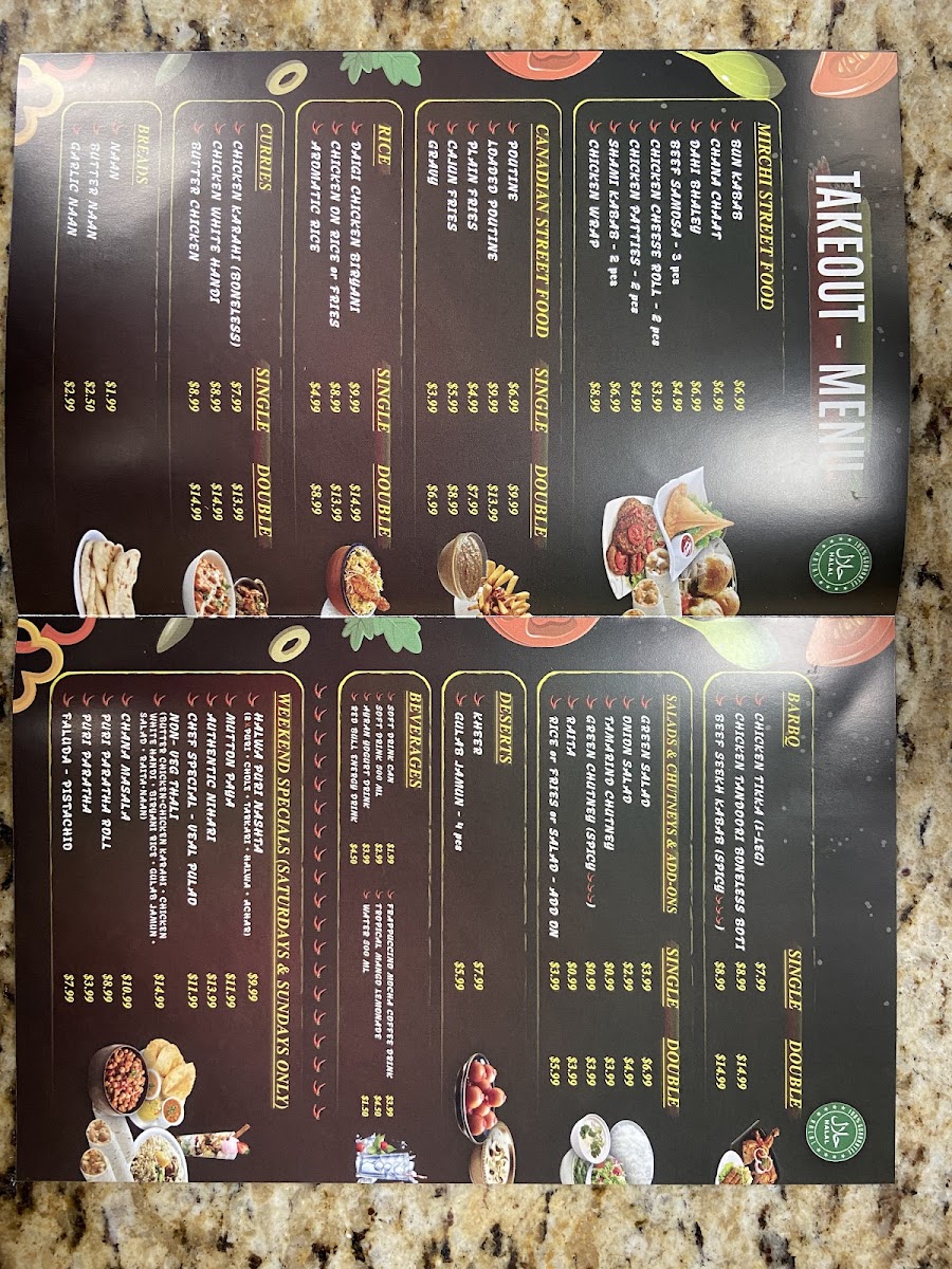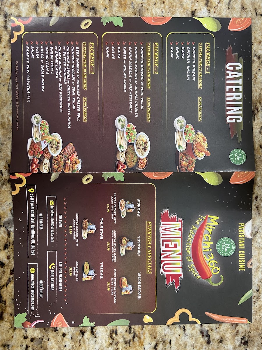 The menu at Mirchi 360 offers a variety of Indian and Pakistani dishes with a focus on Halal cuisine, suitable for takeout or catering. It is organized into several categories to accommodate different meal preferences and dining occasions.